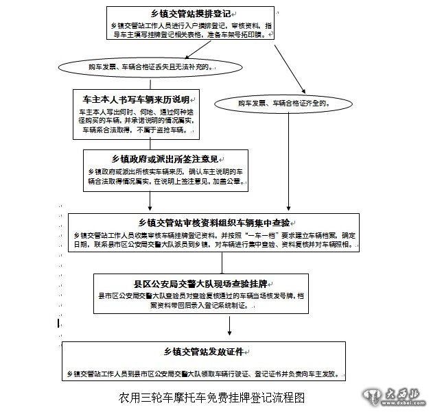 在免費(fèi)辦理片證工作中,交警部門簡(jiǎn)化工作流程,便民利民。三輪汽車摩托車辦牌業(yè)務(wù),由鄉(xiāng)鎮(zhèn)交管站根據(jù)前期排摸登記情況收取審核登記資料。并確定日期,聯(lián)系轄區(qū)交警大隊(duì)派員到鄉(xiāng)鎮(zhèn),對(duì)無(wú)牌車輛進(jìn)行集中查驗(yàn)、復(fù)核資料。轄區(qū)交警大隊(duì)對(duì)復(fù)核通過(guò)的車輛當(dāng)場(chǎng)核發(fā)號(hào)牌,并制證后,由鄉(xiāng)鎮(zhèn)交管站負(fù)責(zé)向車主發(fā)放行駛證和登記證書。交警大隊(duì)在錄入系統(tǒng)時(shí)發(fā)現(xiàn)有盜搶嫌疑的或在登記系統(tǒng)中已經(jīng)注冊(cè)登記的,收回號(hào)牌。車主自行前往交警大隊(duì)申請(qǐng)辦理業(yè)務(wù)的,由大隊(duì)車管所按照原工作流程辦理并于當(dāng)日核發(fā)牌證。對(duì)三輪汽車嚴(yán)格執(zhí)行財(cái)政部、稅務(wù)總局《關(guān)于農(nóng)用三輪車免征購(gòu)置稅的通知》的規(guī)定,免征車輛購(gòu)置稅。另外,對(duì)資料不全的,自登記之日起不得轉(zhuǎn)籍過(guò)戶。