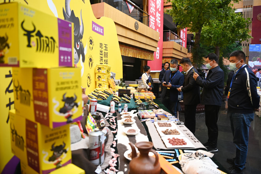 7月20日,在首屆中國(玉樹)牦牛產業大會上,與會代表參觀玉樹牦牛系列產品展臺。新華社記者范培珅攝