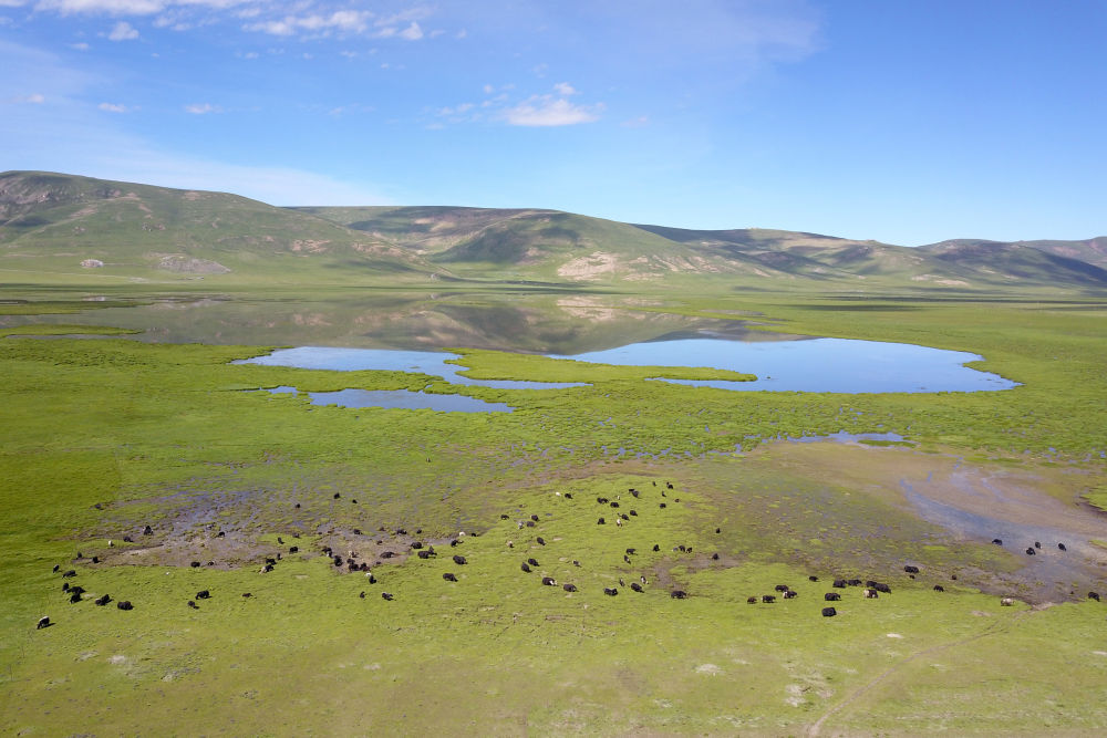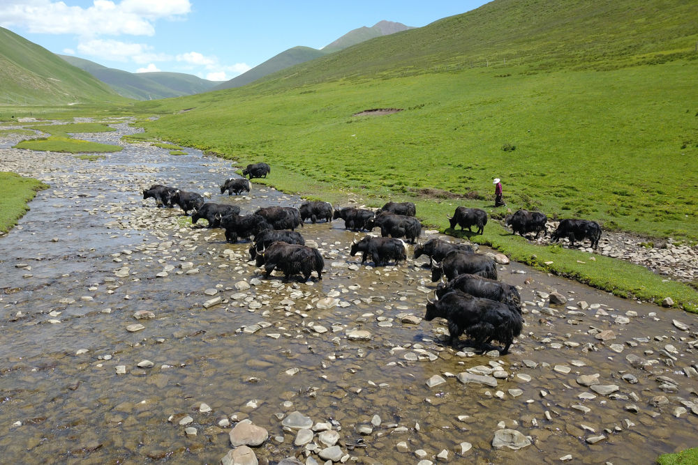這是7月4日在玉樹藏族自治州稱多縣歇武鎮拍攝的牦牛(無人機照片)。新華社記者范培珅攝