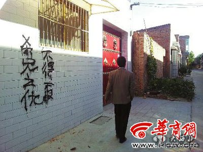 案發后,王伯陽家的墻上被人噴的“殺兄之仇不得不報”的字樣 本報記者 崔永利 攝