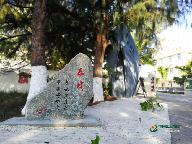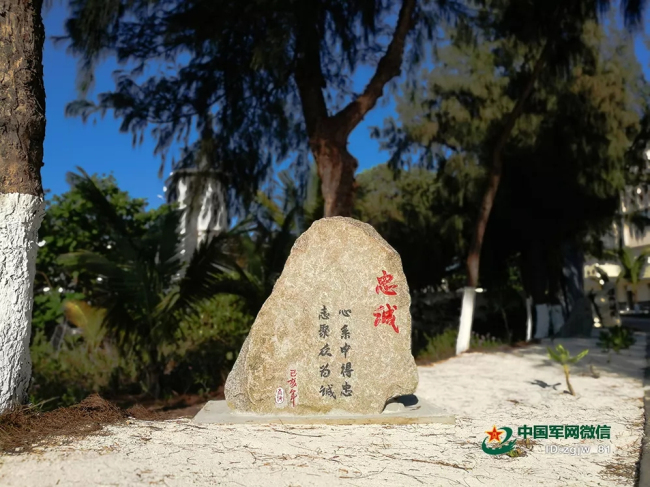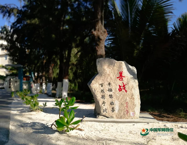 直通營區的路叫石刻路。石刻路旁有四塊石刻,也就是中建島訓:忠誠、善戰、樂戍、鑄疆。忠誠,即忠于祖國,忠于黨中央,這是中建的第一塊名片;善戰,即中建人不僅有愛國愛島的赤子情懷,還有英勇頑強,敢打敢拼的血性膽氣;樂戍,即中建人40年如一日堅守在祖國海防甘于犧牲奉獻,以苦為榮,苦中作樂,苦中有為;鑄疆,即中建人經受惡浪洗禮和白沙磨礪,立起了一塊又一塊豐碑,鑄就起了海疆長城。