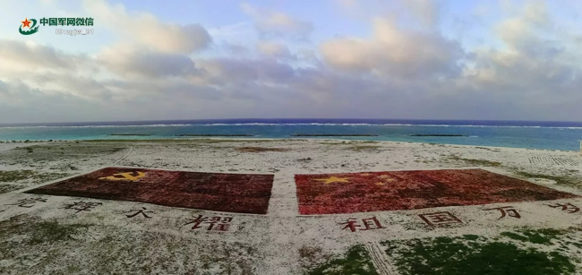 在“自建”中,最惹眼的還要數白沙灘上兩面“黨輝永耀”“祖國萬歲”的黨旗、國旗了。這兩面長66M、寬44M、占地5000平方的旗幟,是官兵們利用兩個月的訓練間隙用海馬草一點一點“種”出來的。