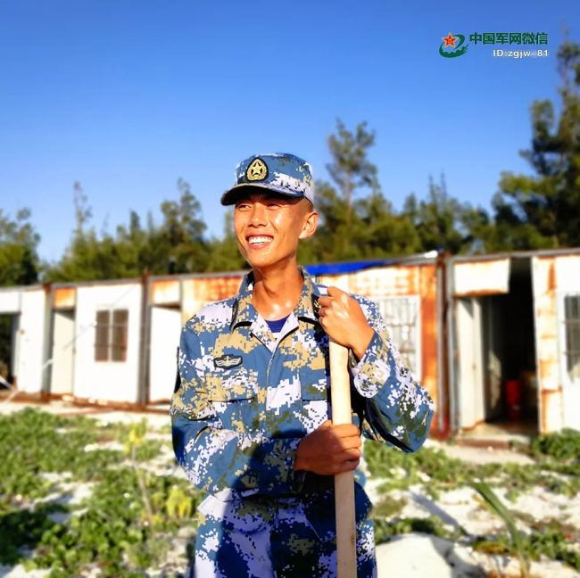 從開始的寸草不生、一毛不拔島到如今的郁郁蔥蔥,從早期“背土上島”到種樹種草,一代代辛勤好學的中建人用雙手和汗水共同建設了一個軍中樂園、島上花園。目前,他們在中建島已開辟菜地370平方米,種活59種植物、六千多棵樹。這個成績,著實不易。