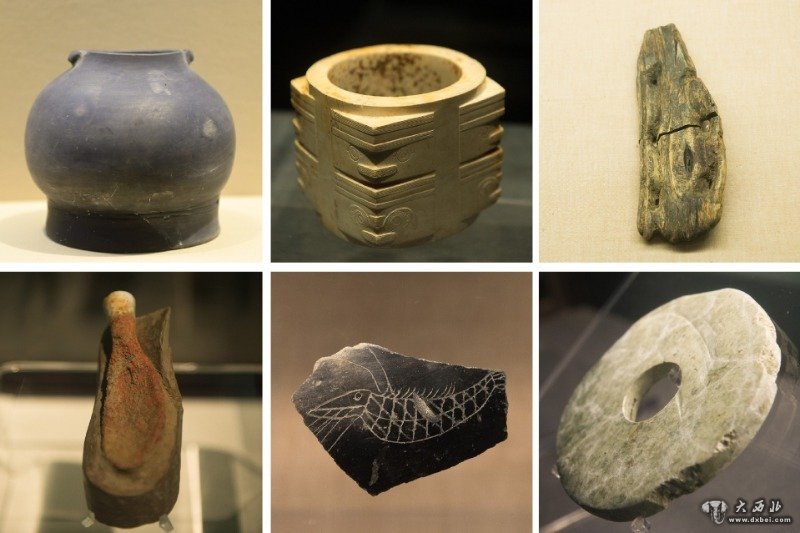 這是良渚文化遺址出土的黑陶器、玉琮、木屐、漆器、陶片和玉璧(左上起,順時針方向)。新華社記者翁忻旸攝