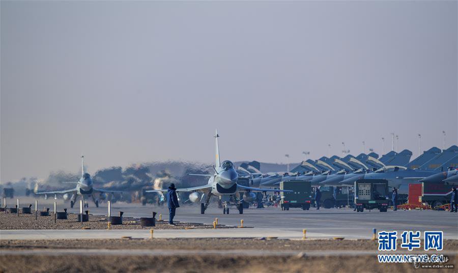 在空軍某試驗訓練基地組織的“紅劍”演習中,兩架殲-10C戰機滑出(2019年11月30日攝)。新華社發(楊軍 攝)