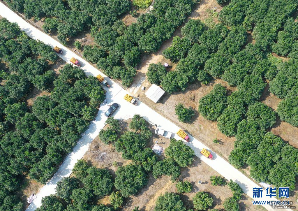 在廣西羅城仫佬族自治縣金玉柚生態產業扶貧示范區,裝載柚子的車輛在柚子園內行駛(2019年11月5日攝,無人機照片)。新華社記者 陸波岸 攝