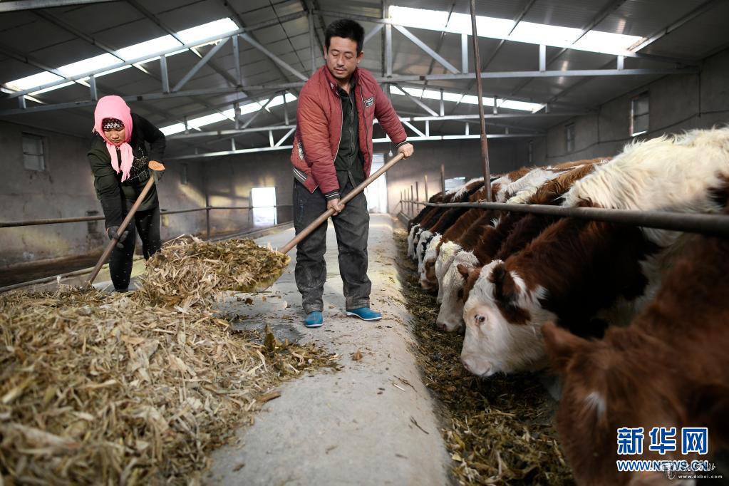 寧夏吳忠市同心縣河西鎮旱天嶺村村民馬國才(右)、馬婷夫婦在村里的養牛合作社喂牛(2017年12月21日攝)。新華社記者 王鵬 攝