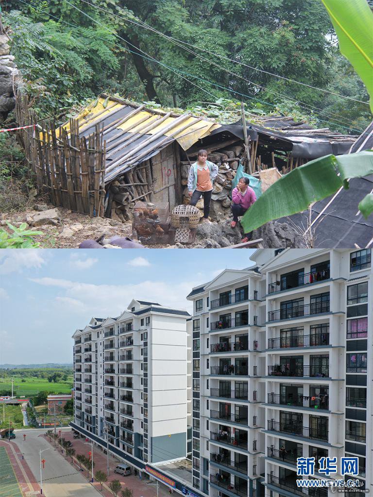 這是一張拼版照片,上圖為:2018年11月11日在廣西田東縣思林鎮龍邦村拍攝的村民和自家簡陋的房屋(思林鎮政府供圖);下圖為:2019年8月28日拍攝的當地為龍邦村新建的位于田東縣思林鎮的易地扶貧搬遷安置點(無人機照片,新華社記者曹祎銘攝)。新華社發