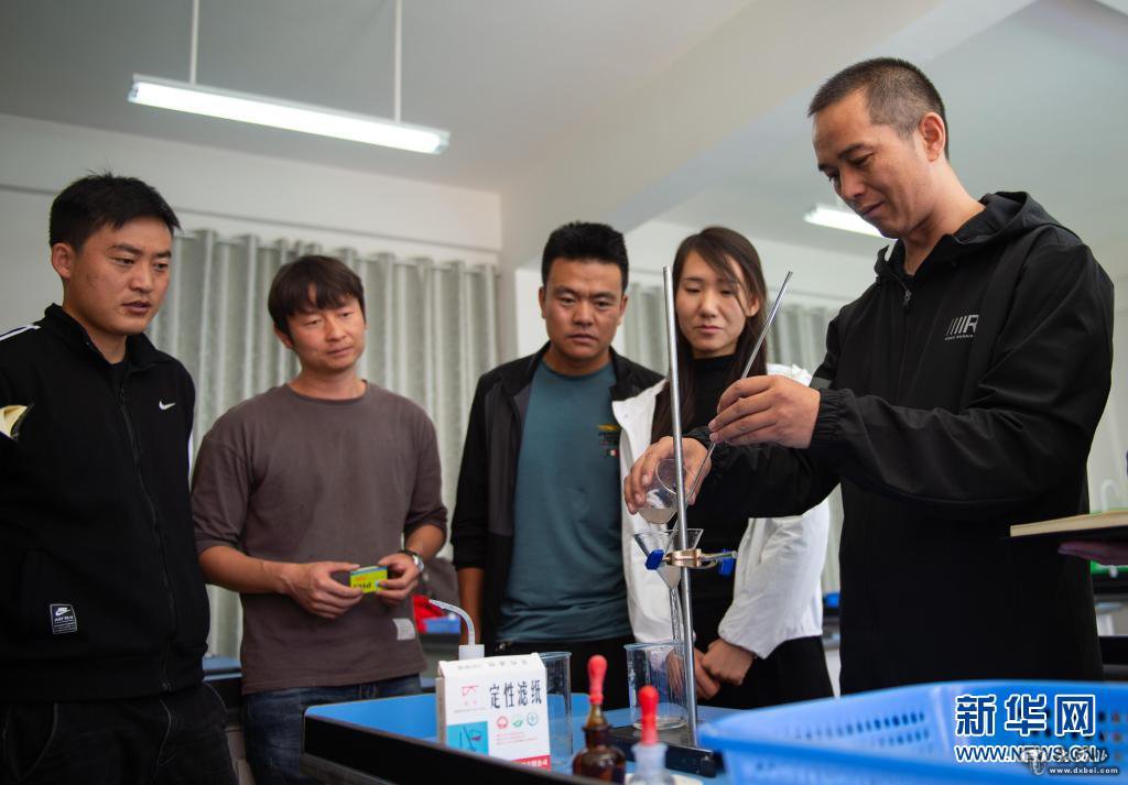 北京市援青支教教師、來自通州區陸辛莊學校的化學教師祁生貴(右一)在青海省玉樹州第四民族高級中學指導學校教師進行實驗教學(2020年8月12日攝)。新華社記者 陳鐘昊 攝
