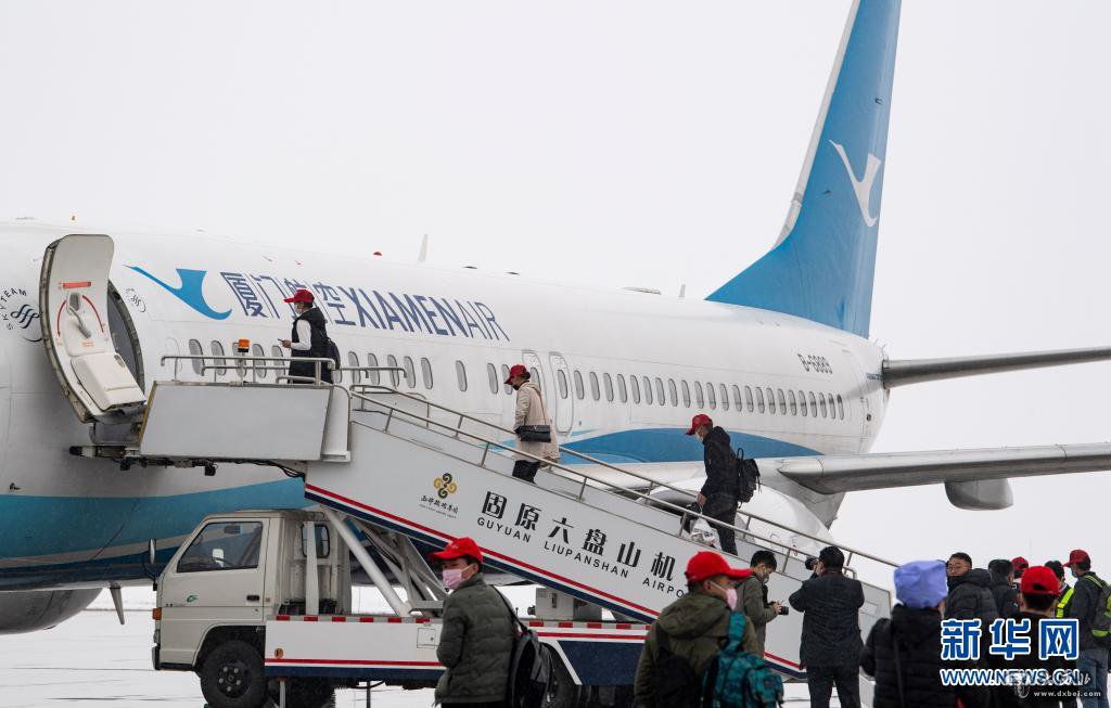 在寧夏固原六盤山機場,固原市原州區、西吉縣的務工人員乘包機前往福建(2020年2月27日攝)。新華社記者 馮開華 攝