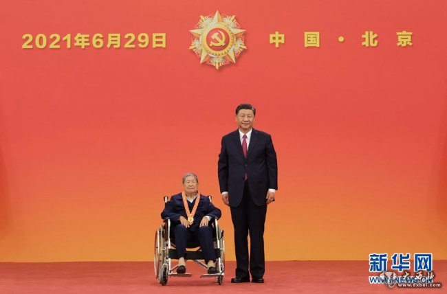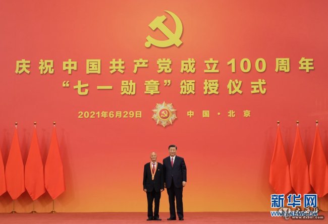 6月29日,慶祝中國共產黨成立100周年“七一勛章”頒授儀式在北京人民大會堂金色大廳隆重舉行。中共中央總書記、國家主席、中央軍委主席習近平向“七一勛章”獲得者李宏塔頒授勛章。新華社記者 李學仁 攝