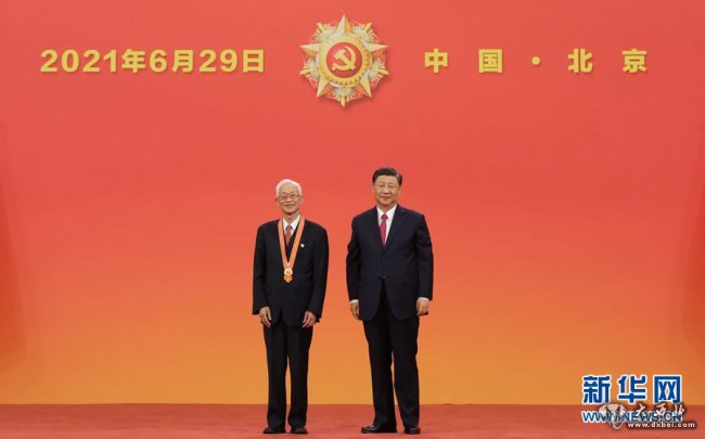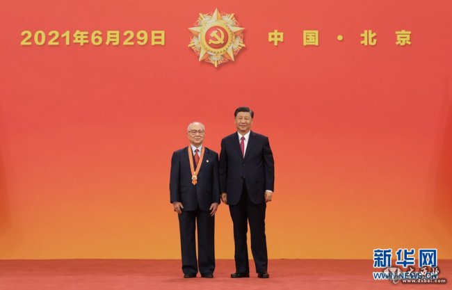 6月29日,慶祝中國共產黨成立100周年“七一勛章”頒授儀式在北京人民大會堂金色大廳隆重舉行。中共中央總書記、國家主席、中央軍委主席習近平向“七一勛章”獲得者周永開頒授勛章。新華社記者 李學仁 攝