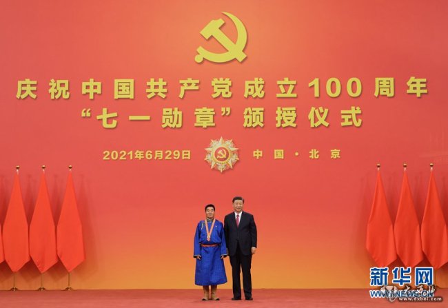 6月29日,慶祝中國共產黨成立100周年“七一勛章”頒授儀式在北京人民大會堂金色大廳隆重舉行。中共中央總書記、國家主席、中央軍委主席習近平向“七一勛章”獲得者廷·巴特爾頒授勛章。新華社記者 李學仁 攝