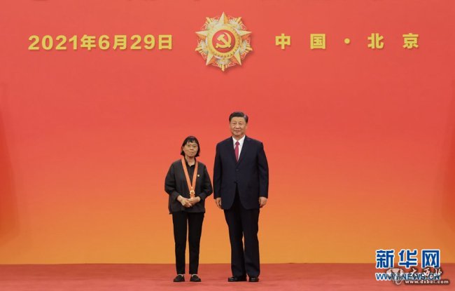 6月29日,慶祝中國共產黨成立100周年“七一勛章”頒授儀式在北京人民大會堂金色大廳隆重舉行。中共中央總書記、國家主席、中央軍委主席習近平向“七一勛章”獲得者張桂梅頒授勛章。新華社記者 李學仁 攝