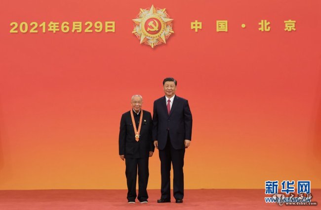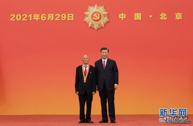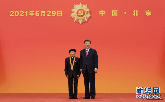 6月29日,慶祝中國共產黨成立100周年“七一勛章”頒授儀式在北京人民大會堂金色大廳隆重舉行。中共中央總書記、國家主席、中央軍委主席習近平向“七一勛章”獲得者黃大發頒授勛章。新華社記者 李學仁 攝