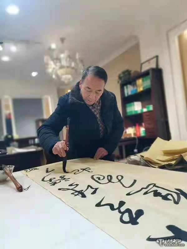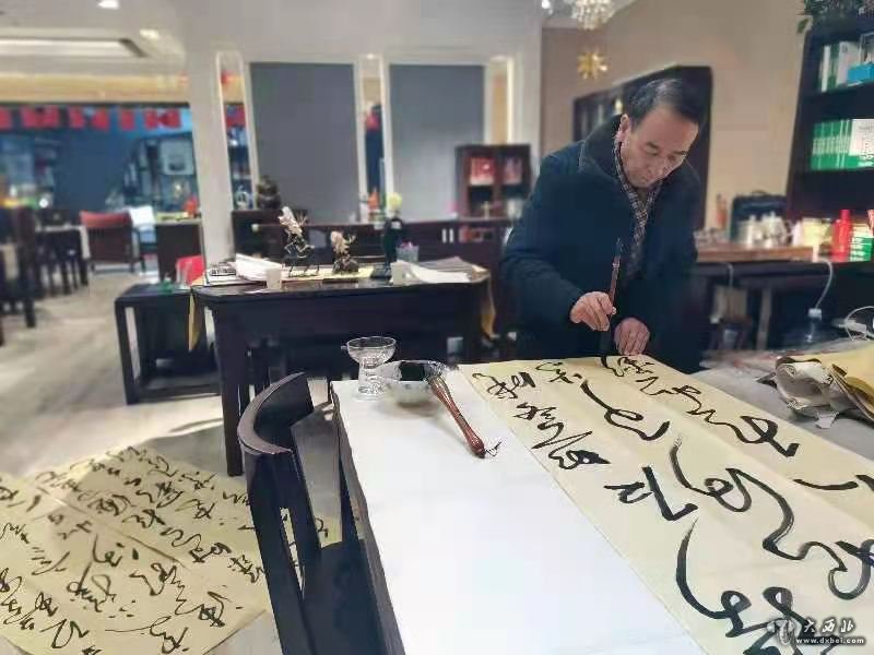 大西北網(wǎng)訊(記者王志儉文圖)2022年第二天,記者走入蘭州三森家具城半島風(fēng)情家具店時(shí),看到一位男子正在揮毫潑墨,而地上已經(jīng)擺放了六七張作品。男子名叫劉恒忠年屆七旬,他正在默寫唐朝詩人白居易的《琵琶行》。