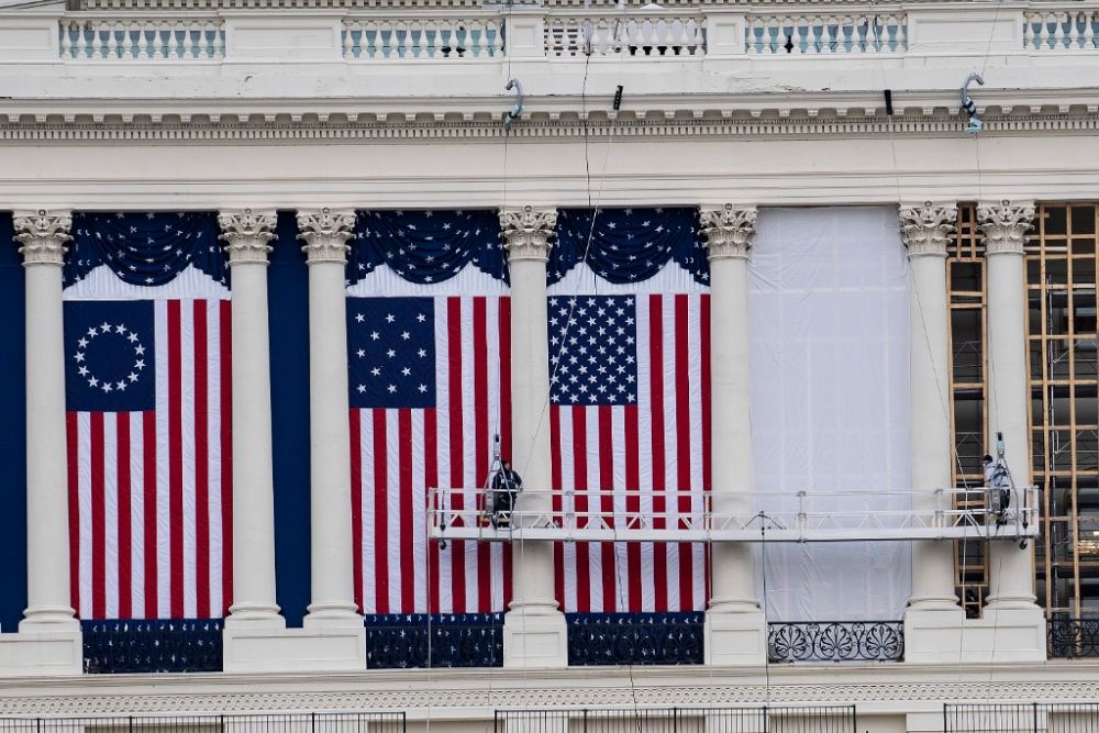 2021年1月11日,在美國首都華盛頓,工作人員在國會大廈外懸掛旗幟,為下屆總統的就職典禮做準備。新華社記者劉杰攝