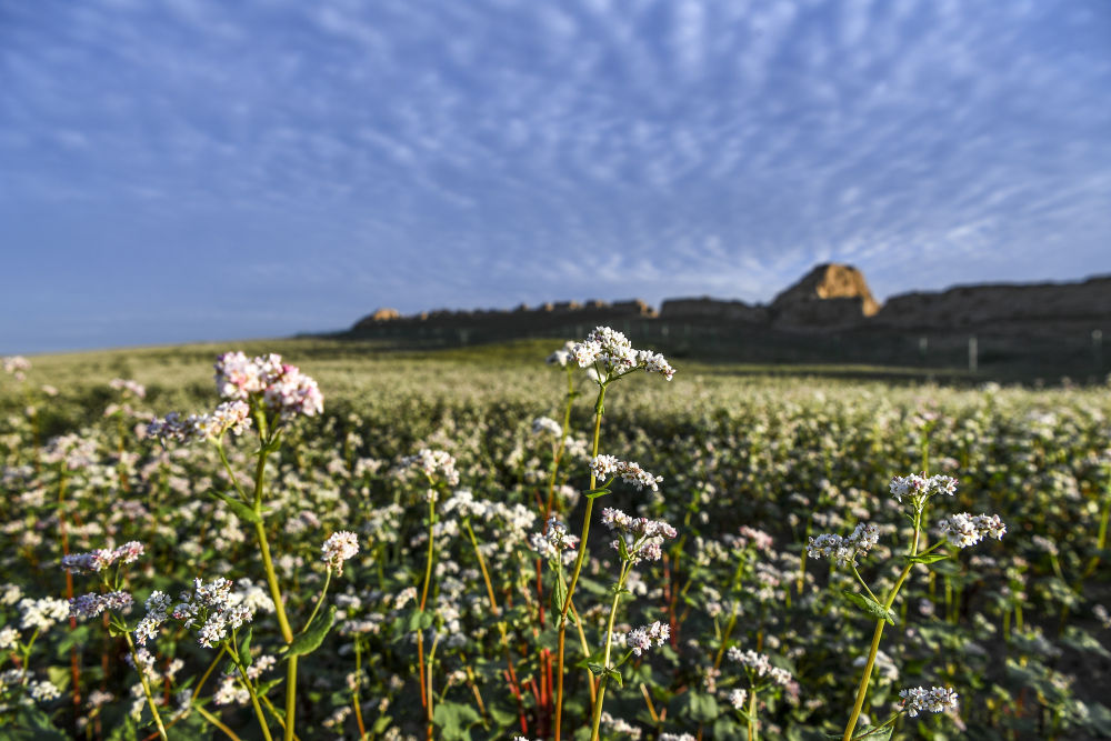 寧夏吳忠市鹽池縣一處長城腳下蕎麥花開放(2023年8月18日攝)。新華社記者 馮開華 攝