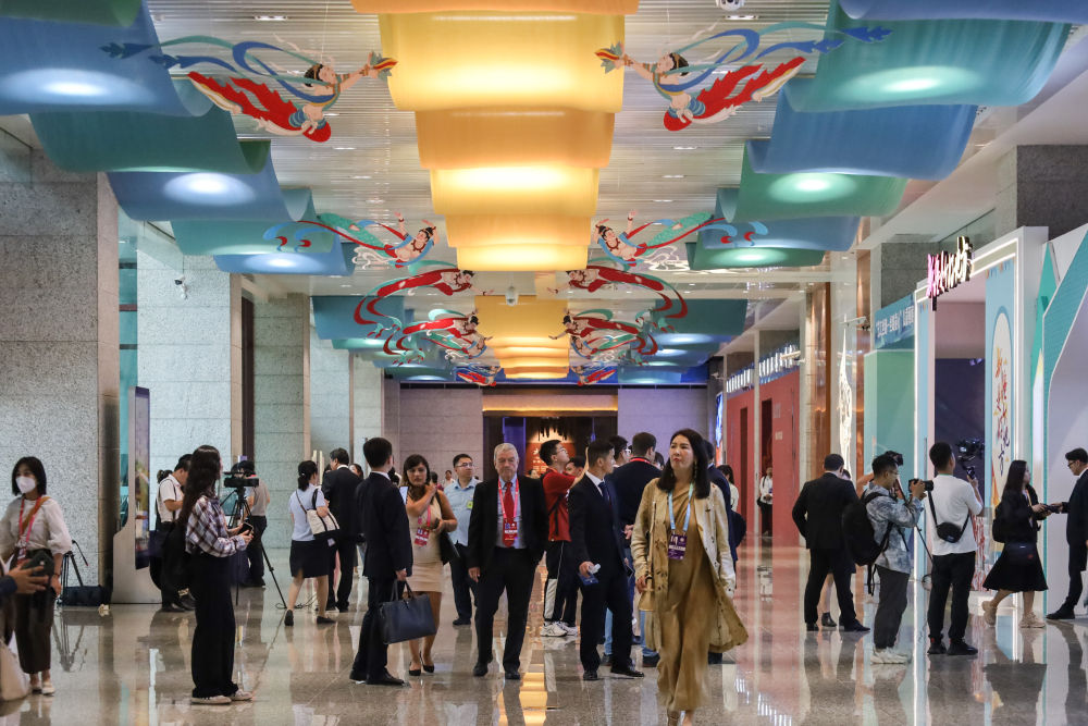 2023年9月6日,與會(huì)嘉賓在第六屆絲綢之路(敦煌)國際文化博覽會(huì)上參觀。新華社記者馬希平攝