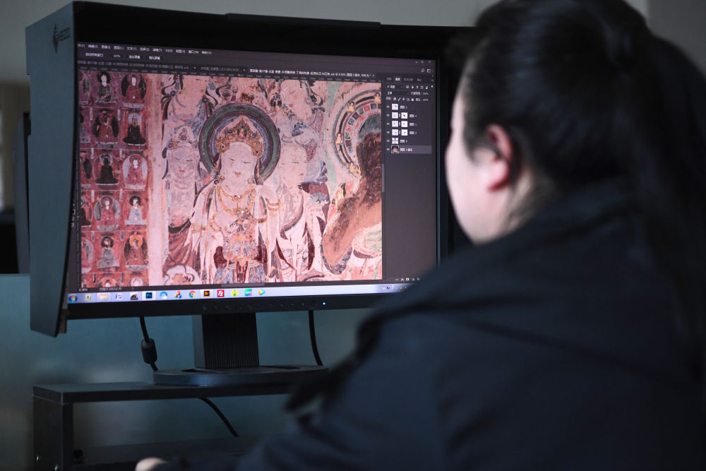 敦煌研究院文物數(shù)字化保護(hù)團(tuán)隊(duì)圖像處理人員年海麗在拼接壁畫圖像(2023年4月25日攝)。新華社記者陳斌攝