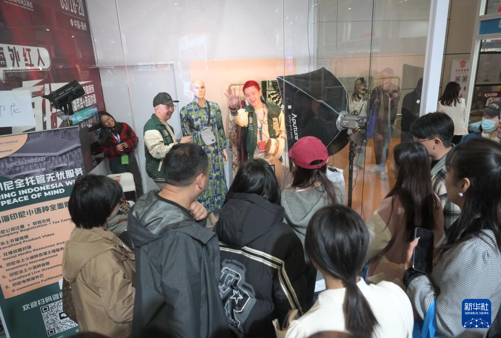 3月18日,參觀者在海外紅人直播專區(qū)觀看印尼網(wǎng)紅直播帶貨。