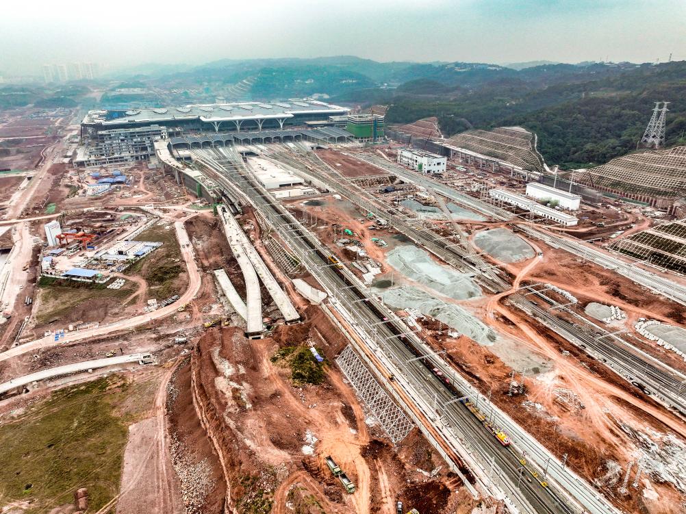 這是11月2日拍攝的渝廈高鐵重慶東站正線鋪軌施工現場(無人機照片)。新華社記者 唐奕 攝