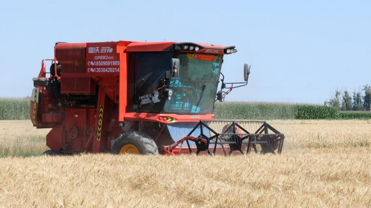 在朱王堡鎮(zhèn)朱王堡村,沉甸甸的麥穗彎著腰,一臺(tái)臺(tái)大型聯(lián)合收割機(jī)在金色的麥田中縱橫馳騁,只見麥穗被卷入機(jī)器“腹中”,粉碎后的小麥秸稈撒在田間,待糧食滿倉后,金黃色的麥粒噴涌而出,裝入一輛輛運(yùn)糧車中。整個(gè)收割過程一氣呵成、井然有序。